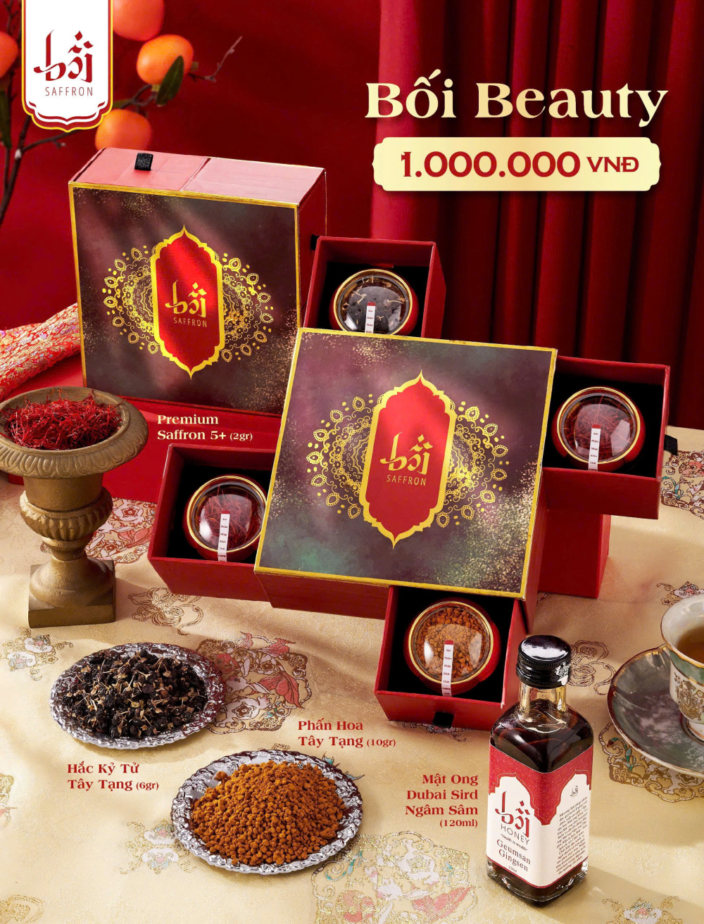 - Saffron Estahban ( 2gram ): Nhập khẩu chính ngạch từ Estahban- Iran sở hữu 7 chứng nhận về nguồn gốc, chất lượng toàn cầu. Với hơn 150 bông hoa được thu hoạch để cho ra 1gram, Saffron đã trở thành một “ liều thuốc “ hiếm có và đắt đỏ nhất Thế Giới.